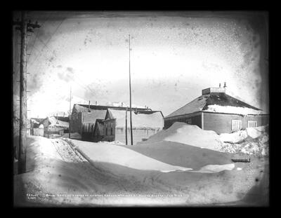 "Coming and going to Anchorage Post Office." [caption] "1917 fall, 14227; Probably labor Day as parade is coming from Labor Temple - big bldg back of second flag pole. Later Shonbeck Bldg, the Hawver Bldg & burned about early 60s (also see hading, 'catastrphe'" [Empress Theatre at center back of image, dirt streets; wooden boardwalks. copy neg.]