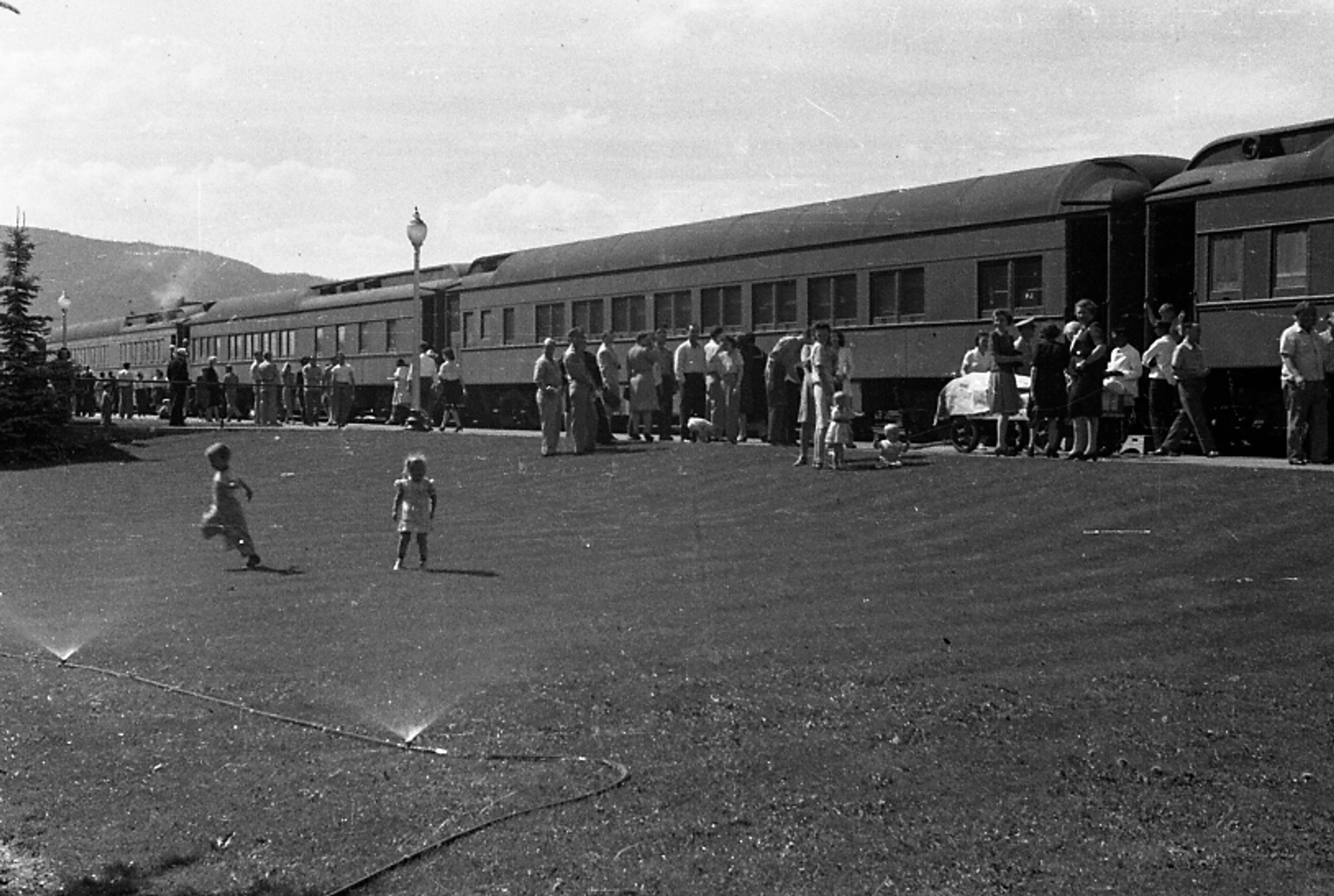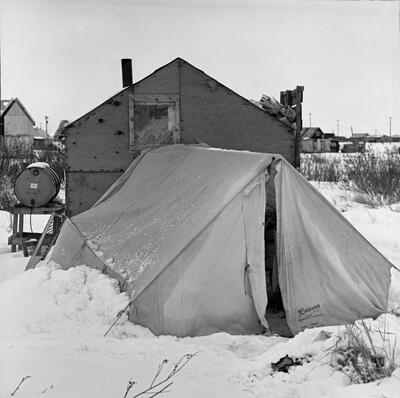 "All same." So St Paul, Matanuska Colonist Project. Hewitt's Photo Shop, Anchorage [tent city next to Alaska Railroad tracks, with men, lumber, and automobiles at Matanuska Colony]