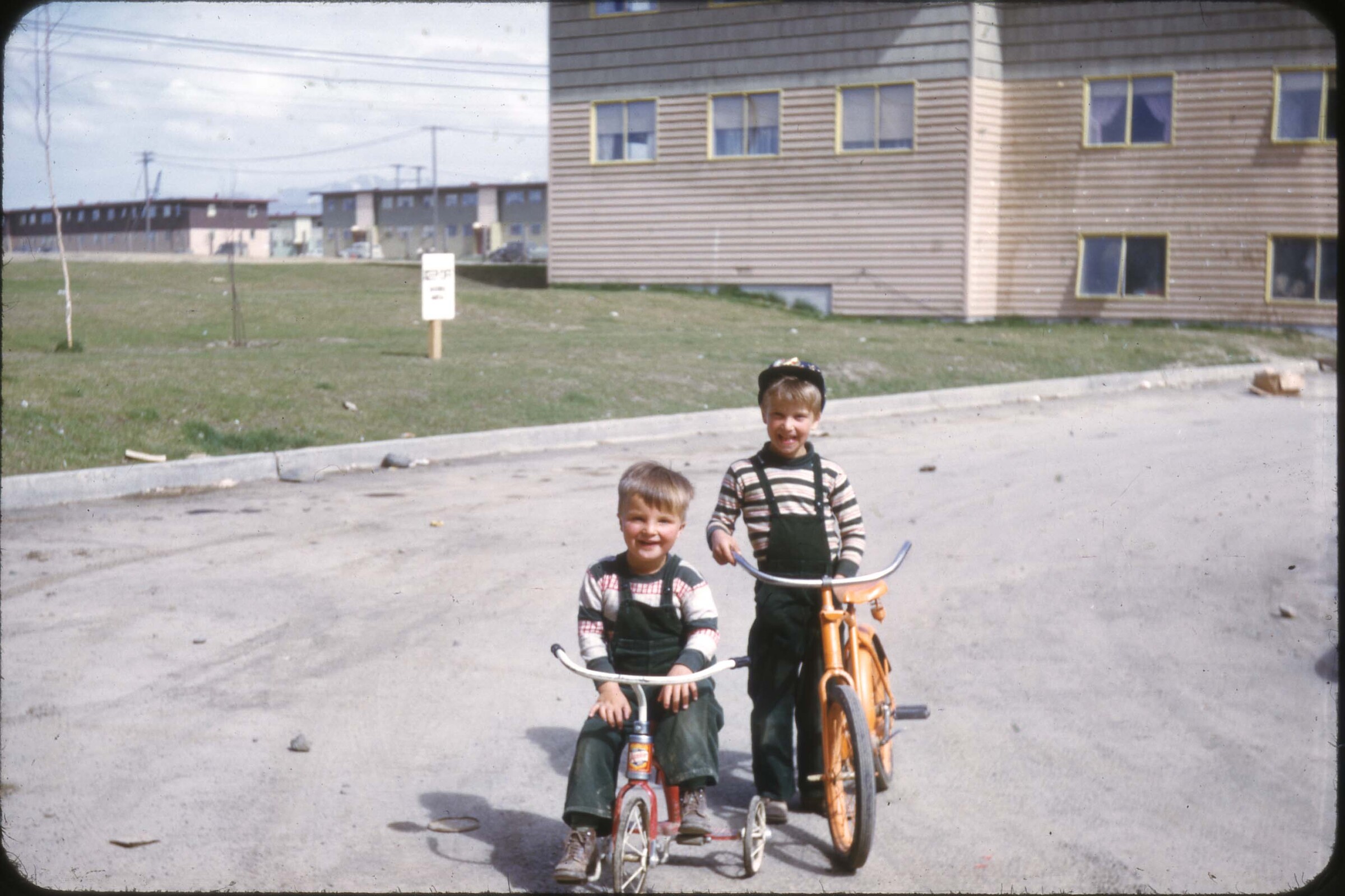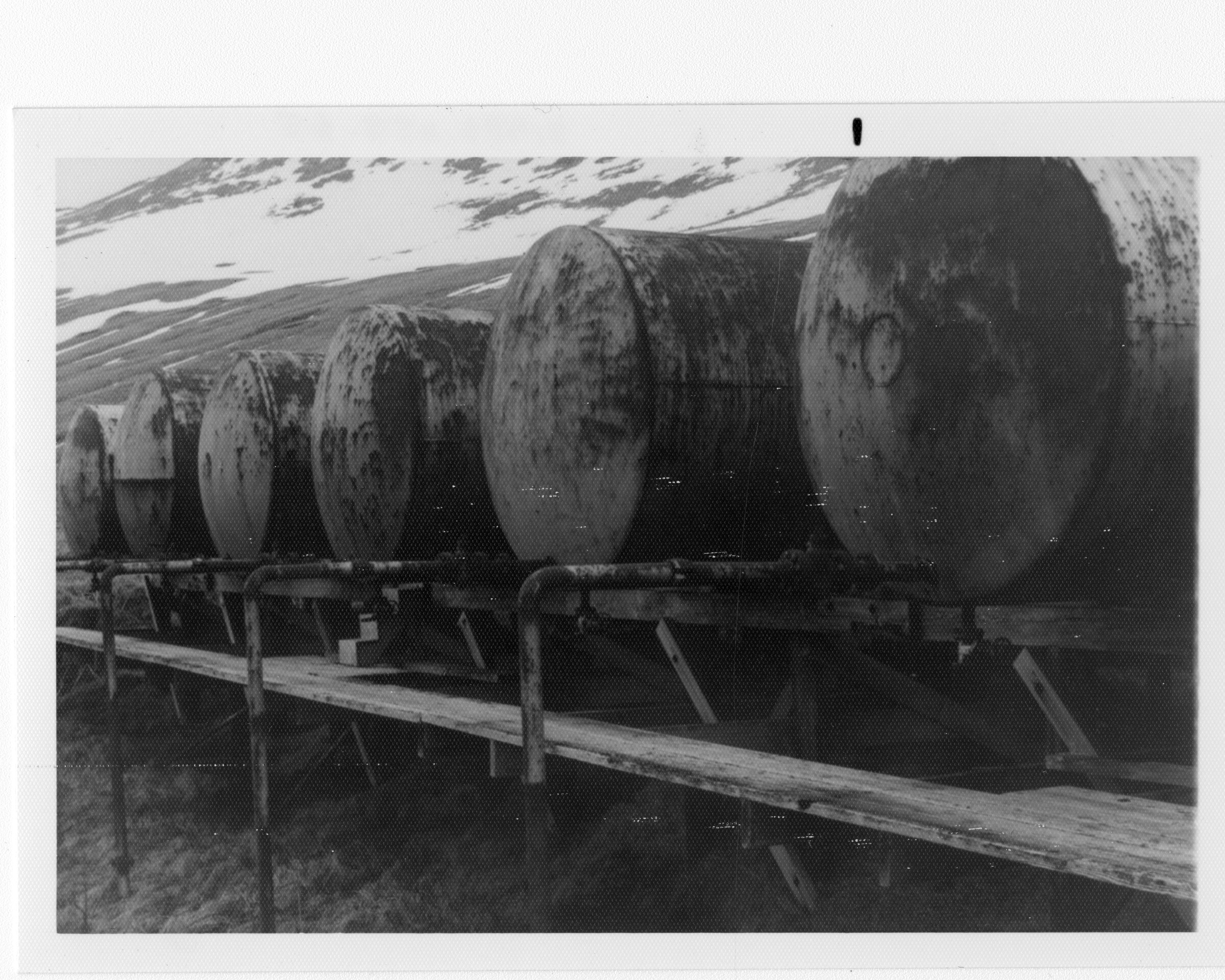 [Quonset huts on gravel road, mountains in distance]