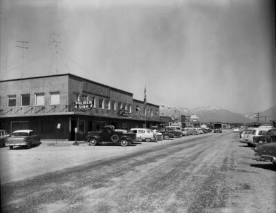 "4 July 1947; some Anchorage historical 4th of July negs." [Bicycles, possibly a race, on downtown street, Eckman's Furniture; 1st National Bank]