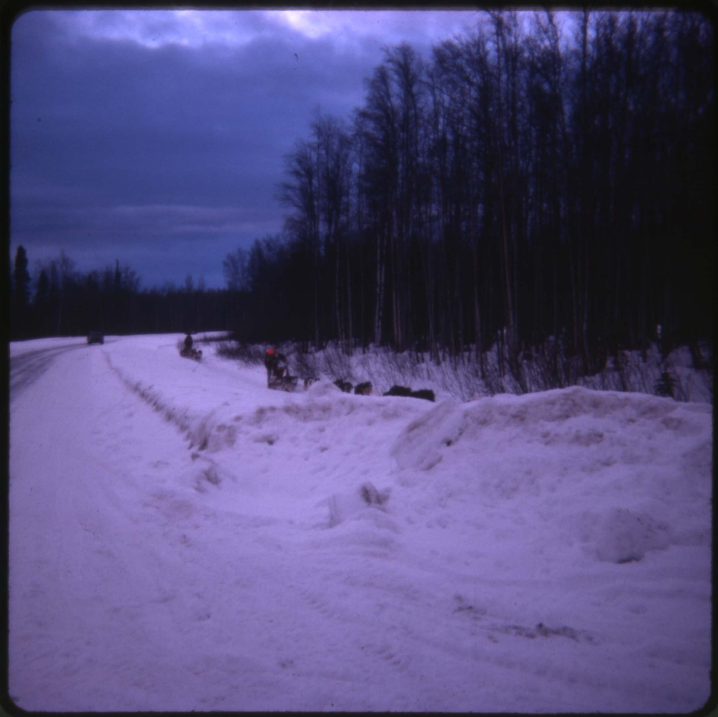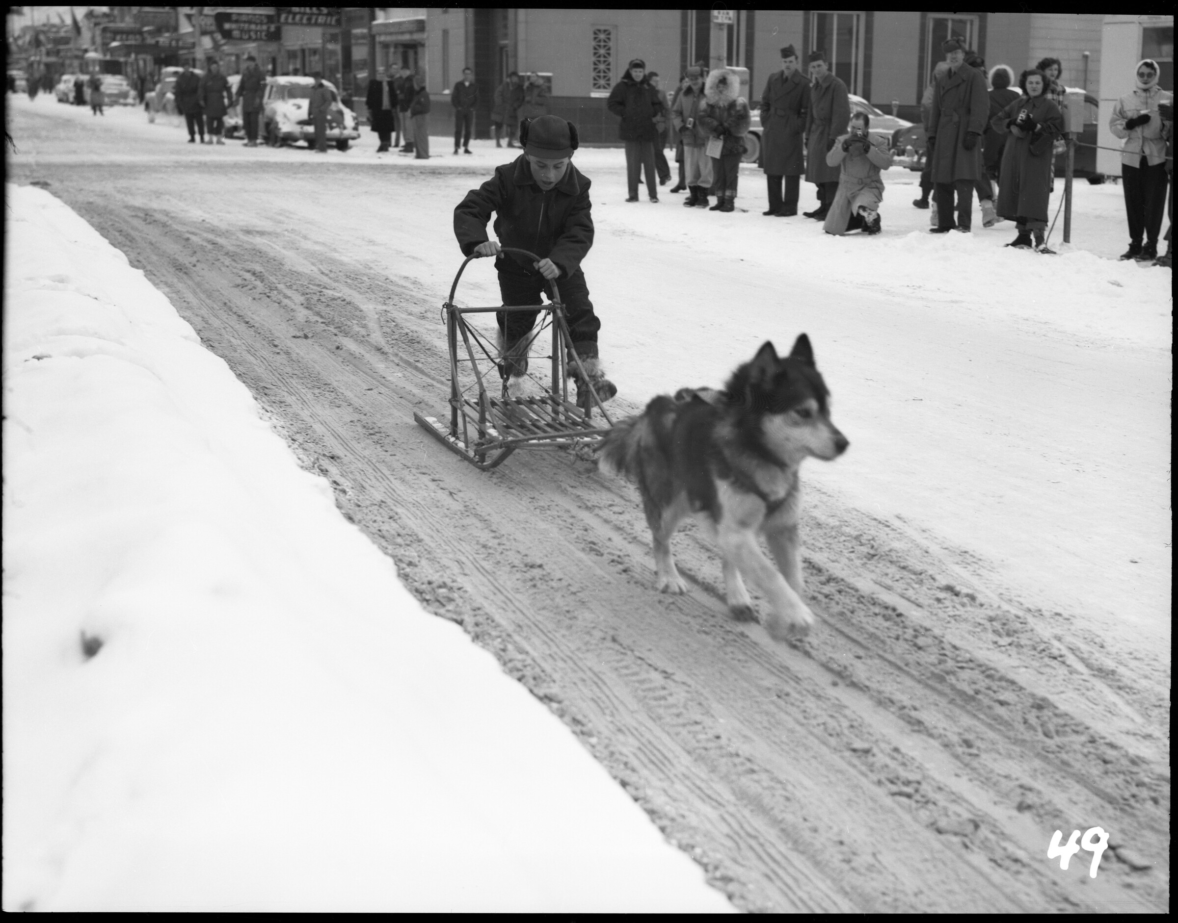 49 (Fur Rendezvous, Last Day of Big Races, 1954) [young boy driving single-dog sled down Fourth Avenue past spectators, sign for Bill's Electric in background]