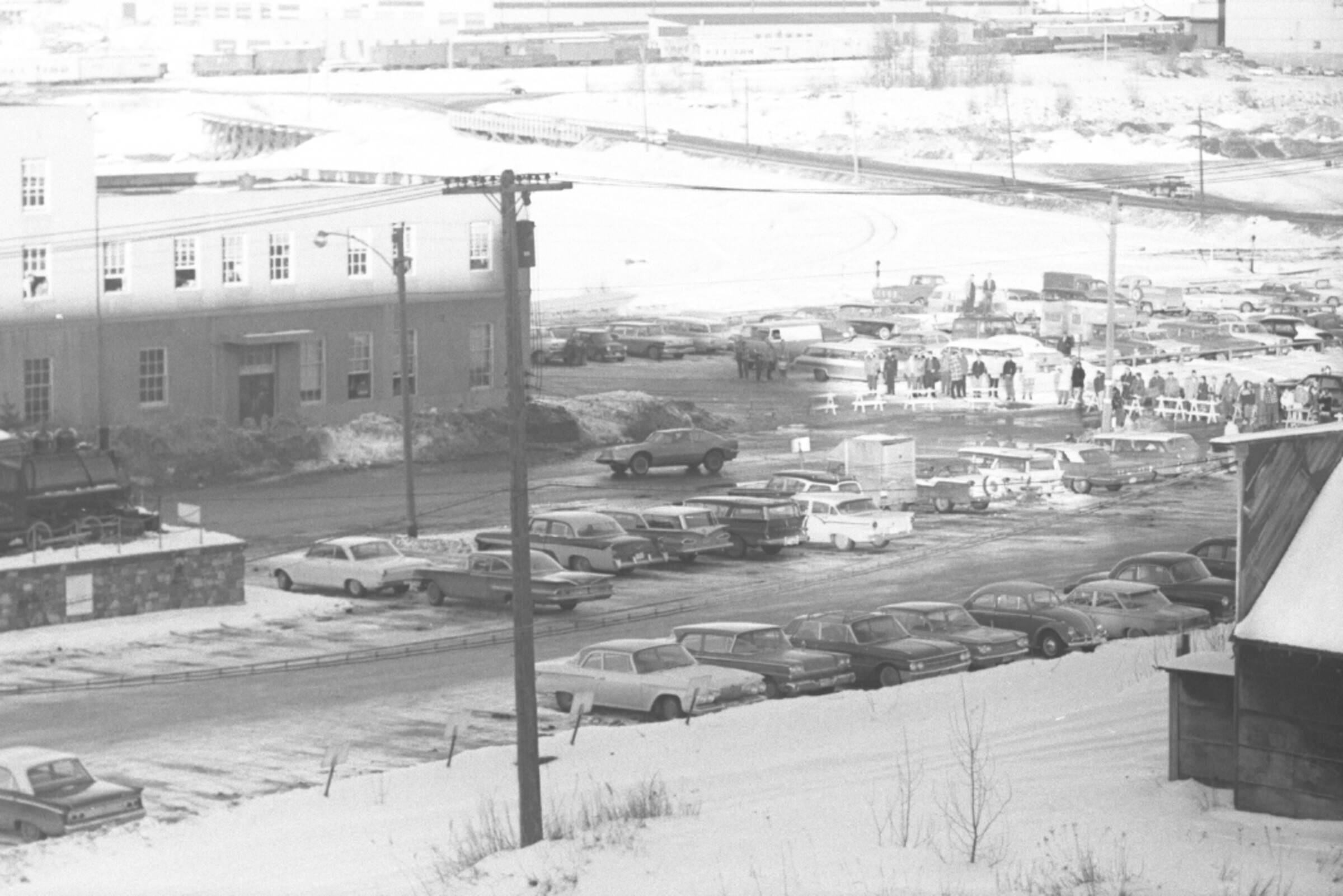 (Sportscar Race, Fur Rendezvous, Anchorage, 1963) [bird's eye view of course passing Alaska Railroad depot on Ship Creek]