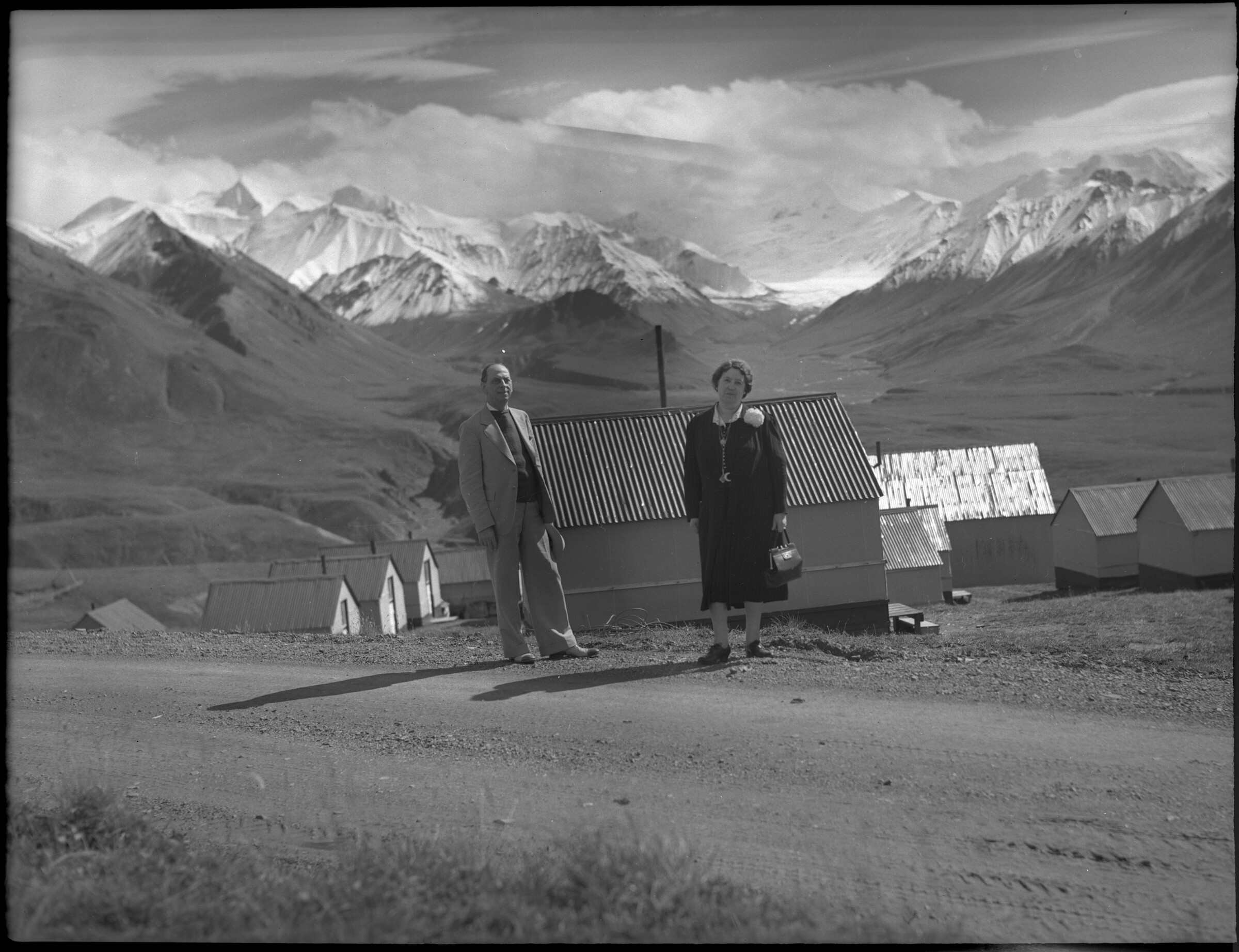 Willow Creek District [man and woman standing on road near cabins; cf. other images filed under Mt. McKinley]