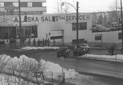 (Sportscar Race, Fur Rendezvous, Anchorage, 1963) [cars passing Alaska Sales and Service]