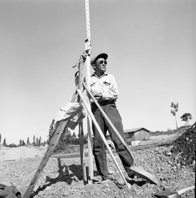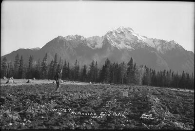 M-27. Matanuska spud patch, 1937. Hewitt's Photo Shop [man standing in potato field with mountains in background]