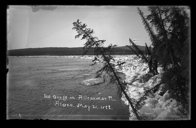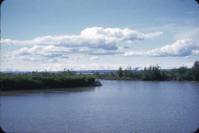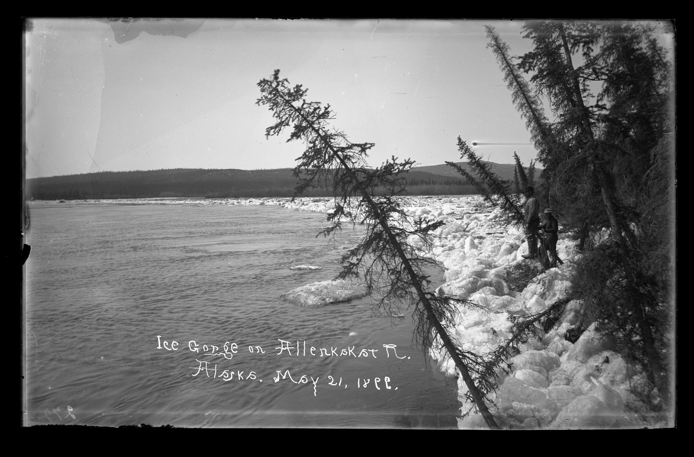 A photograph made from the upper deck of an unknown river steam boat [possibly Steamer Omineca based on image plate AEC_G644] looking downstream towards the outpost town of Susitna Station.
