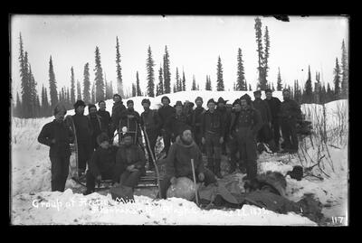 "1930 Quigillingok natives. The snow covered mound on the left is an igloo, the home of some of the natives you see on this picture." [men, women, children pose next to woven grass baskets; neg #B2007.005.6.238]