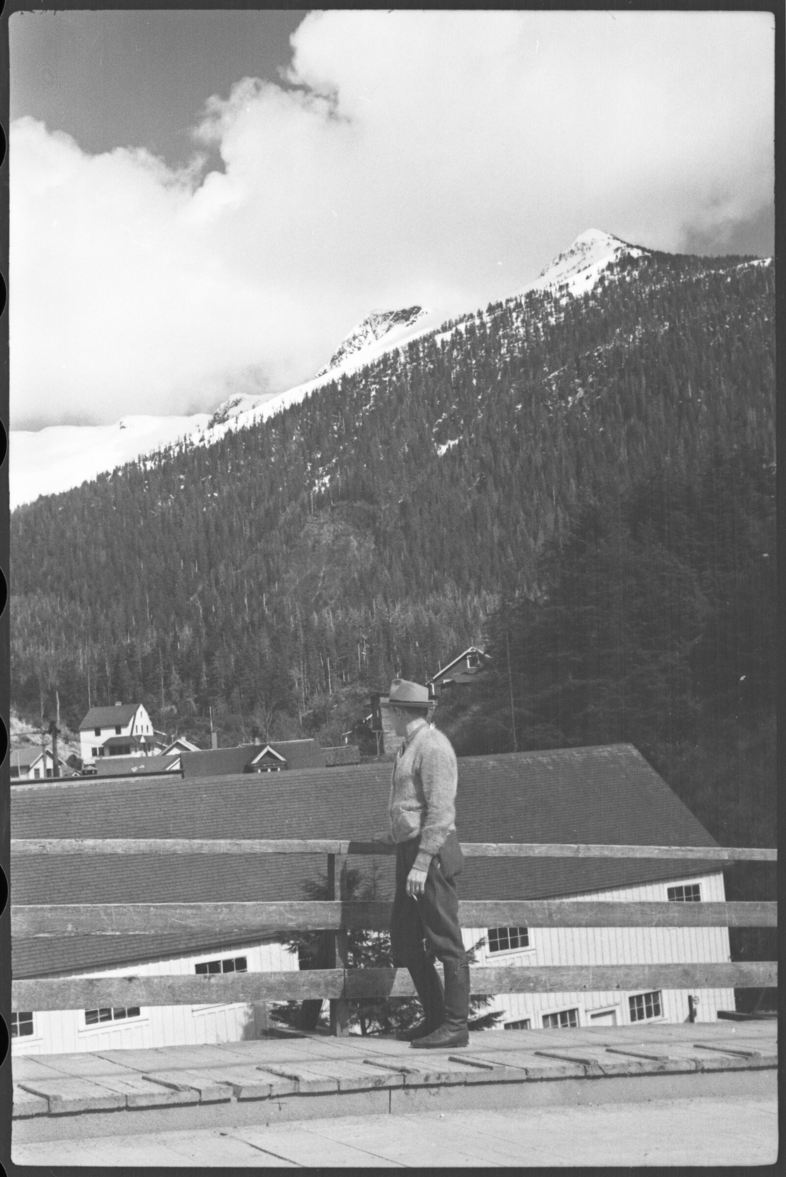 9-3; Deer Mt & John Larsen; 1/200 c 12.5 yellow [man standing on boardwalk; rooftops, structures, mountain in background]