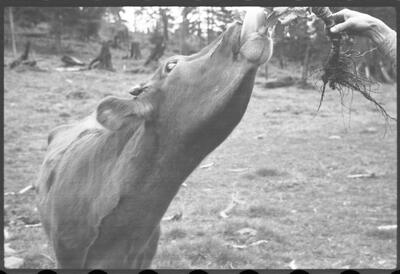 41-6 Ketchy (the cow) at the ranch [cow being fed by hand; trees and stumps in background; March 3, 1940]