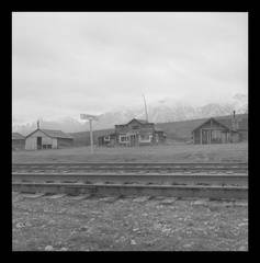 [railroad station, depot, trains, people, automobiles, flag at half staff, grain elevators? in far left]