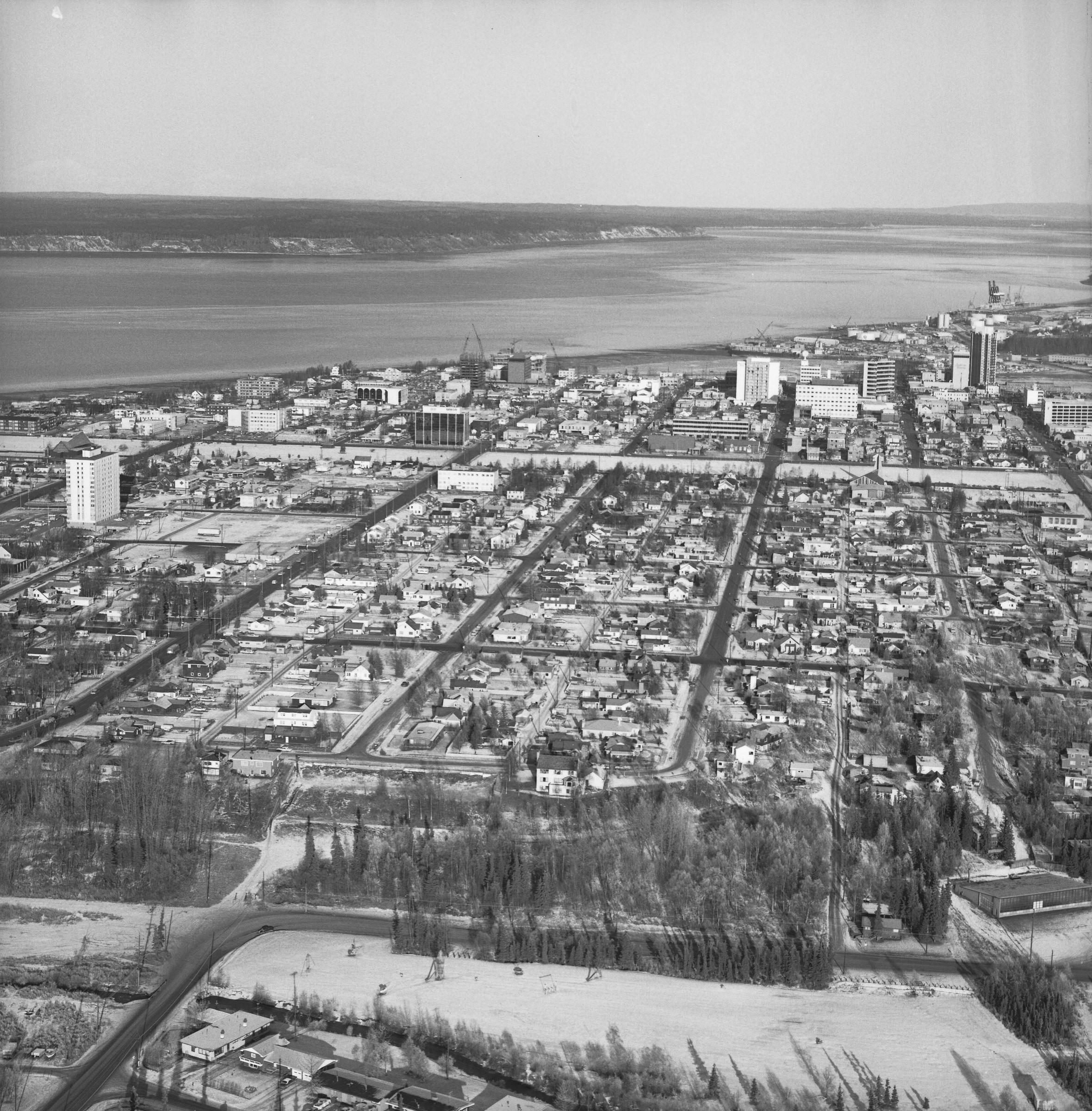 (Anchorage at night) [bird's eye view of long street with residential and business buildings]