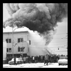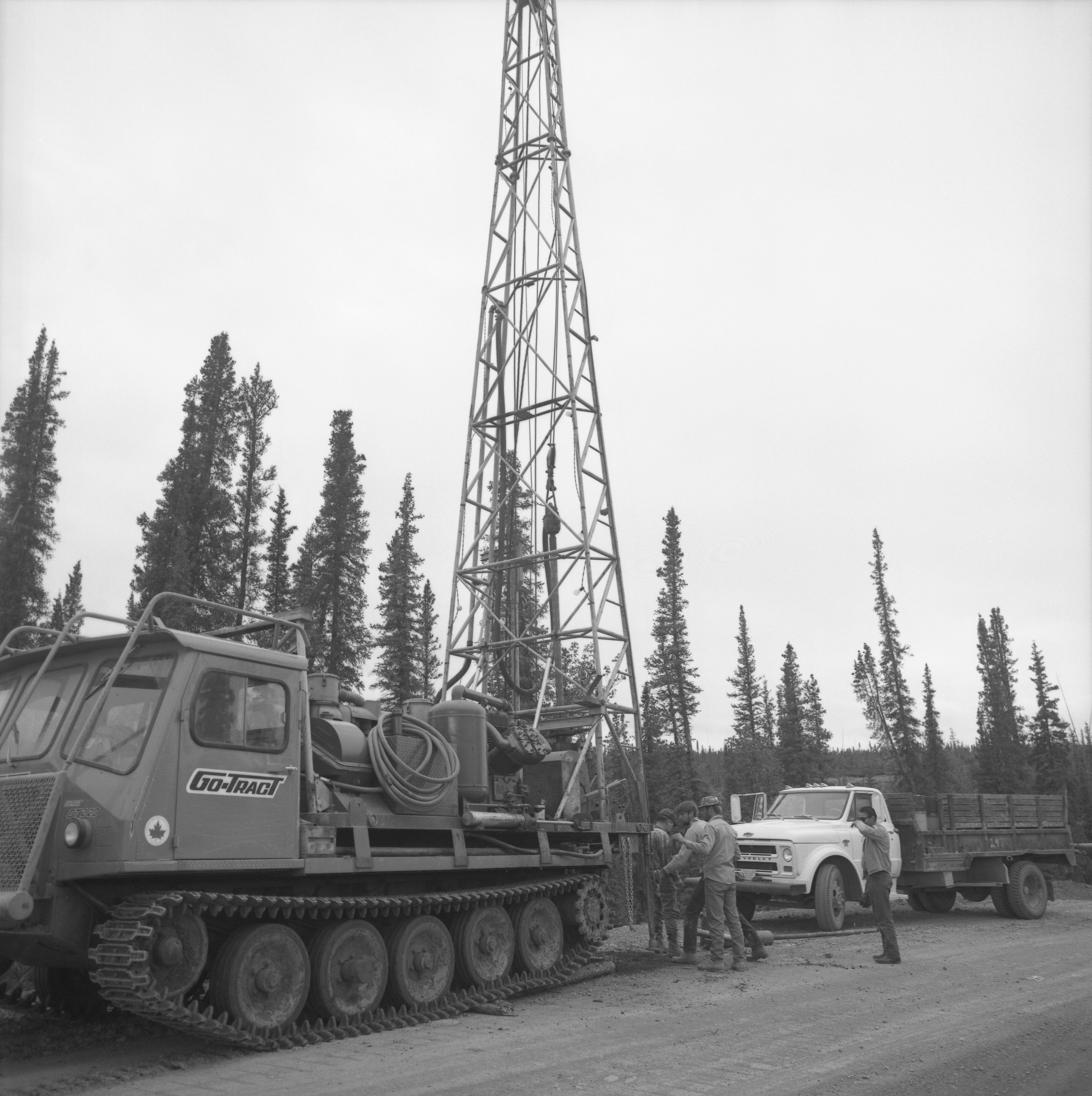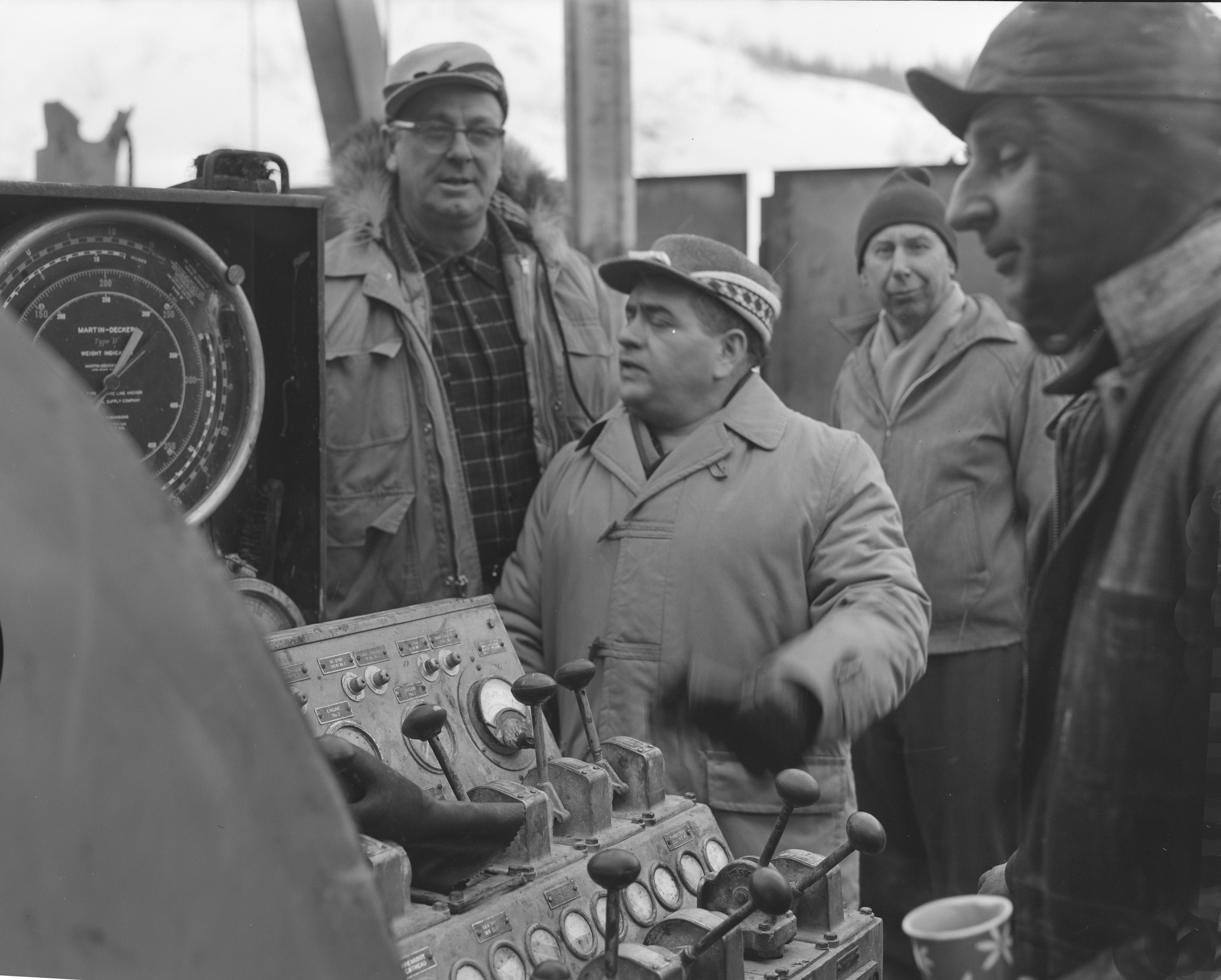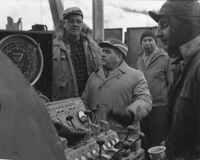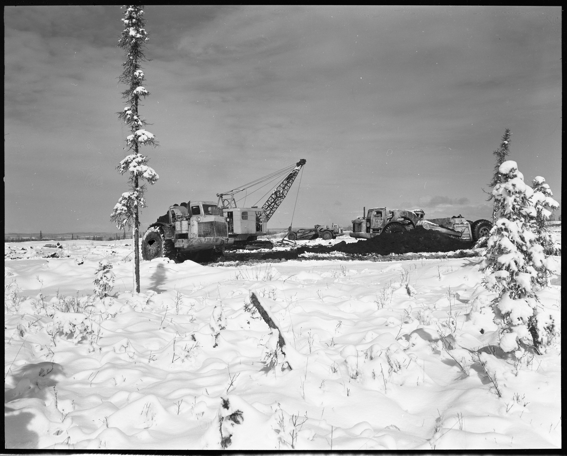 "Construction; April 1963 (new snow)" [earthmovers; dragline excavator; trees]