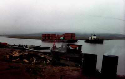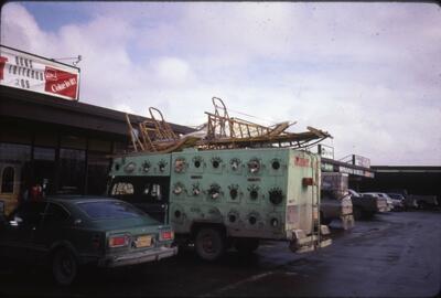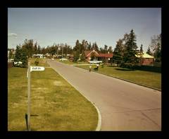 Nome, July 1983 Street scenes [people, man carrying baby in back carrier, man carrying empty brown paper bag; structures, sidewalk]