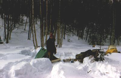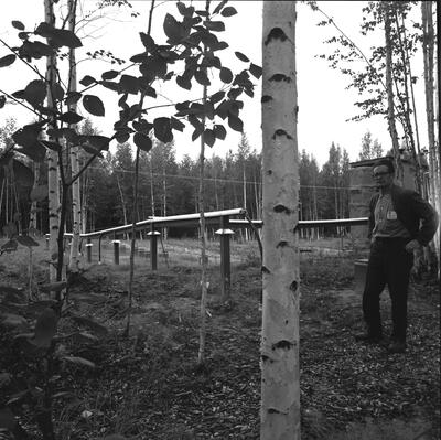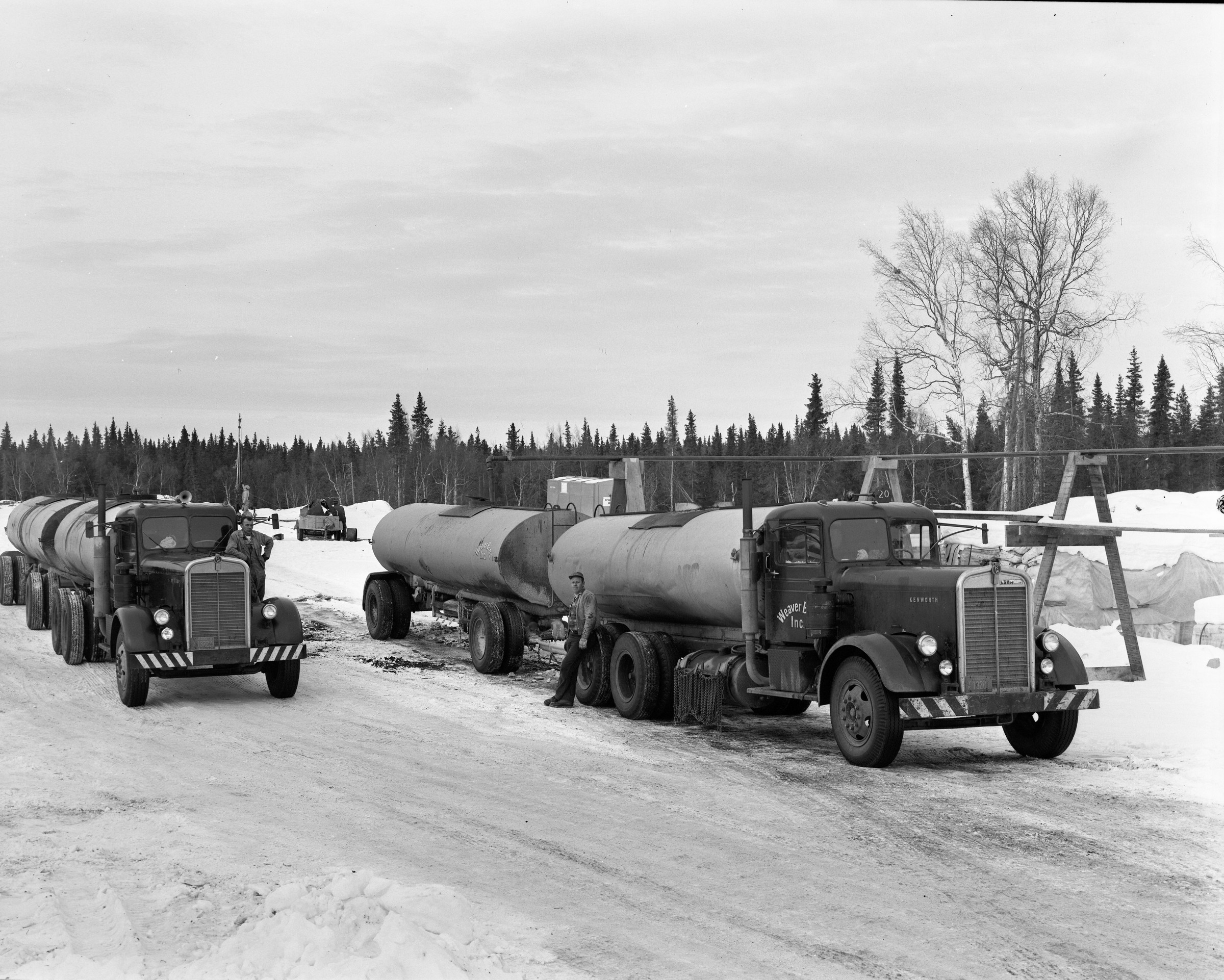 (Snowmobiles_Barrow "Roaring Boring Alice")[man in a white parka, standing in front of a snow machine and numerous oil drums on the tundra, no snow visible]