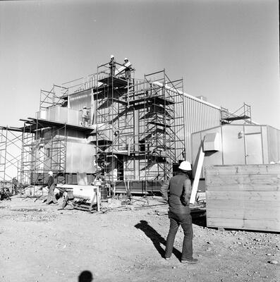 A number of concrete block bldgs of Anchorage to demonstrate that generally those buildings did not suffer serious damage in the March 27 earthquake of 1964. The views were made for Ken Sheppard President of the Alaska Concrete Products corp on Whitney Rd. This image is of the First Federal Savings and Loan Spenard Branch.