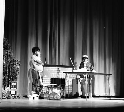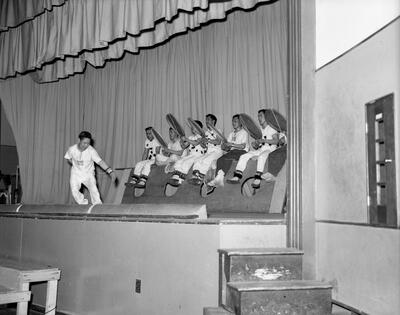 S98 Diomede Island Eskimo soldier doing Native dance for Anchorage Rondezvous (G.I.) [soldier wearing gloves with fur cuffs, drummers, singers, skin drum, furs, mukluks with geometric patterns, stage, curtains]
