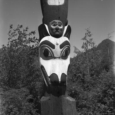62-6 close up of totems [detail of Wolf House Post; Saxman; February 1941]