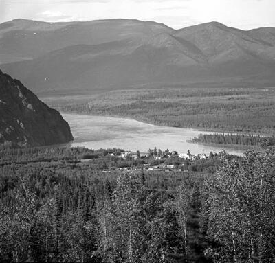 [scenic of broad river valley, mountains in distance, probably Matanuska Valley]