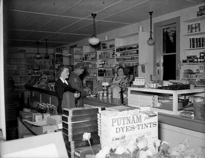 B48 Copper Center Trading Post [two women at counter, scale, groceries, barrel stove, produce; Lipton Tea, Reliance Coffee on counter, Armour's Hennery Eggs]