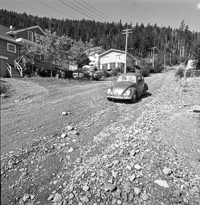 [cemetery with Christian crosses, road at right, mountain in distance, Adak?]
