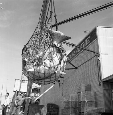 [people cleaning fish on beach, Kotzebue dock in background; print date Sep 69]