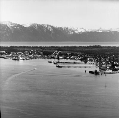 [view from amphibious airplane of two Alaska Native men and woman in skiff with outboard motor, village buildings on shore in background]