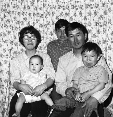 041 J. Sussman Stock Photo Co. Balto. [Baltimore?] Caption on image: “Goetze, Koliutschit Siberia”; [label] “82” Caption on slide: “Eskimos and their igloo Koliutschit, Siberia” [verso of slide: man, women, and child pose outside domicile wearing parkas, mukluks; child holds what is possibly a toy; domicile appears to be made of animal hides, affixed with ropes weighted by stones; possibly water in distance; black and white]