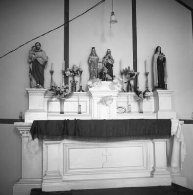 (Emard's House, interior, 3rd and E SE corner, taken for court trial, March 24, 1964) [room with table, chairs, window with blinds, bags of Leslie Salt]