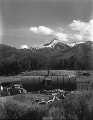 Kenai Lake Bell's Landing, Hewitts Drug Store (Kenai Lake at Bell's Landing)[cache on the shores of Kenai Lake with Chugach mountains in the back ground.