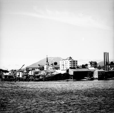 Panoramic Photograph of Downtown Anchorage 1948, looking across Knik Arm towards Pt. Mckinzie and Mt. Susitna. National Photo and News Service photo number 106481