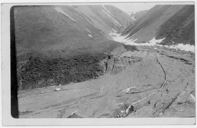 Willow Creek, 1946 [bird's eye view of man working at sluice box in pit at mining operation, Fairbanks Exploration Co.?]