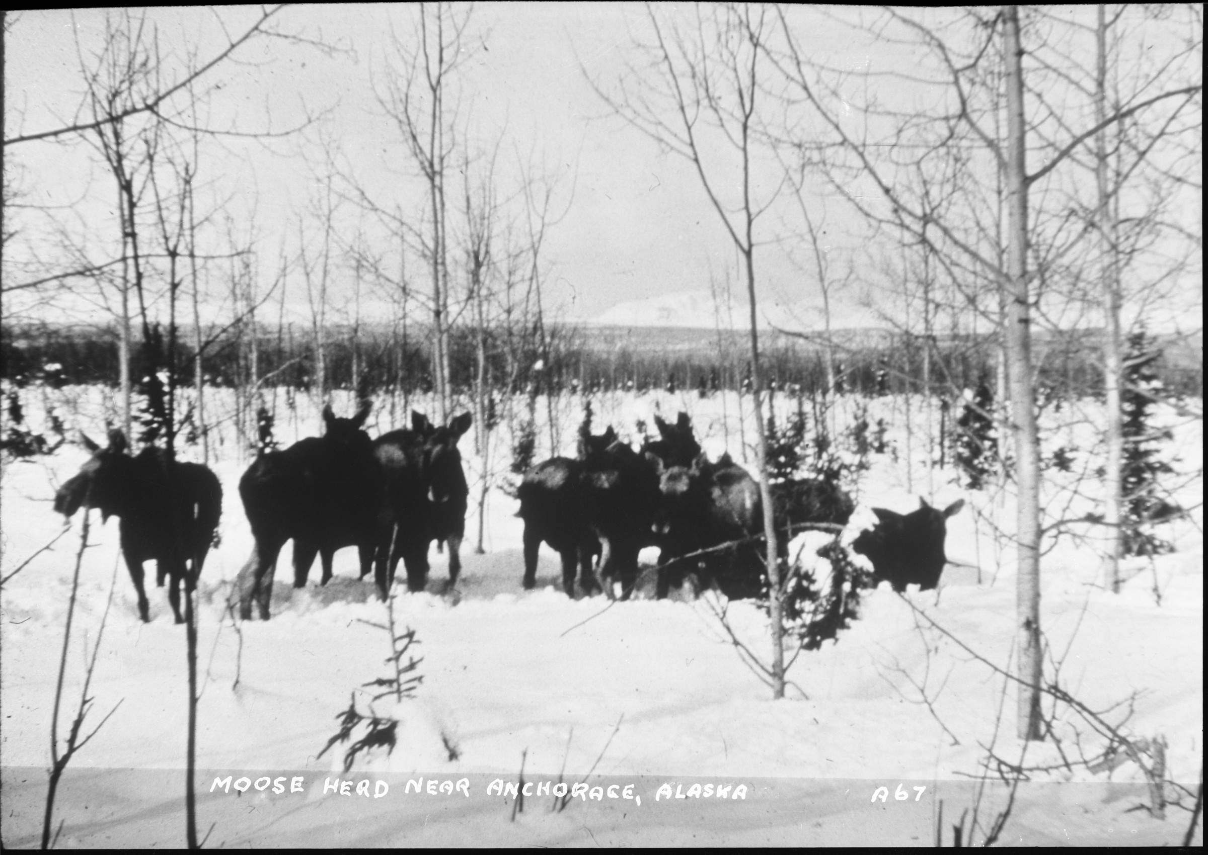 A67 Moose herd near Anchorage (w/caption) [snow, mountains in distance]
