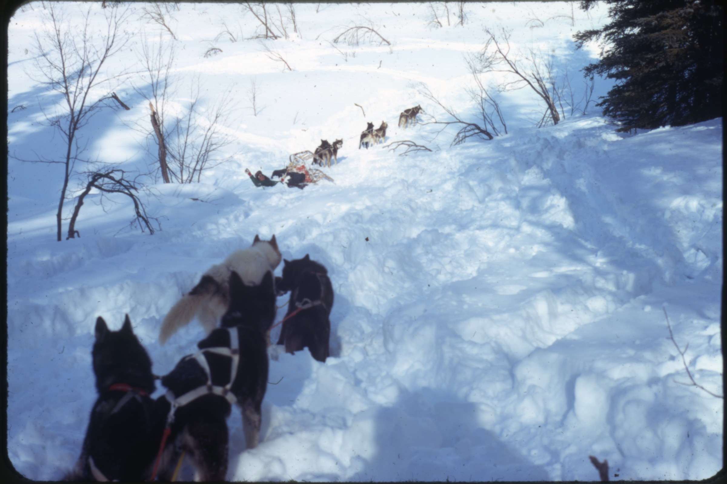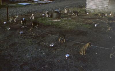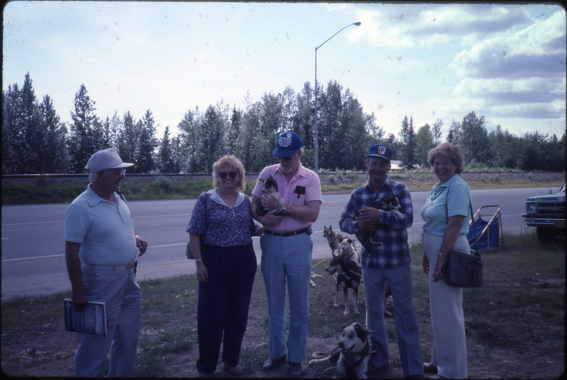 Iditarod Dog Sled Team, Musher Joe Redington Sr. Knik Alaska, Morrison Knudsen sponsor, Hill's Science Diet [dog truck].