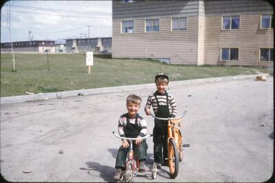 Nome [six Alaska Native children standing next to building; 1950s]