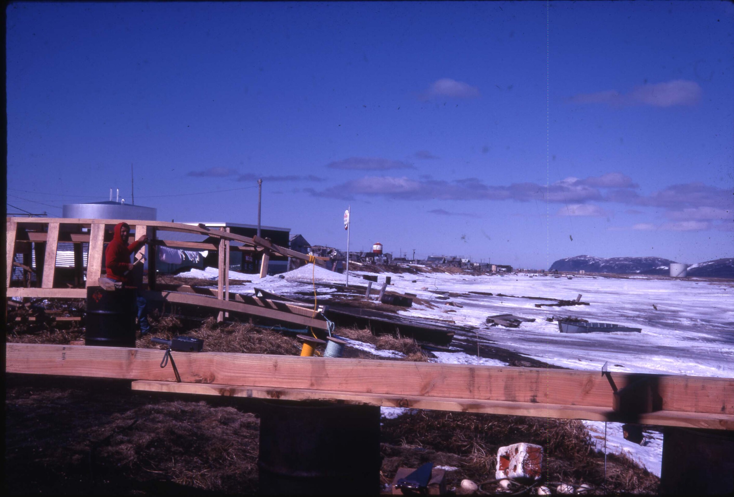 Russian Mission store [village scene in winter, drying rack in foreground, windmill at left, building with picket fence and lumber pile in center, hill with Russian Orthodox cross in background, Russian Mission]