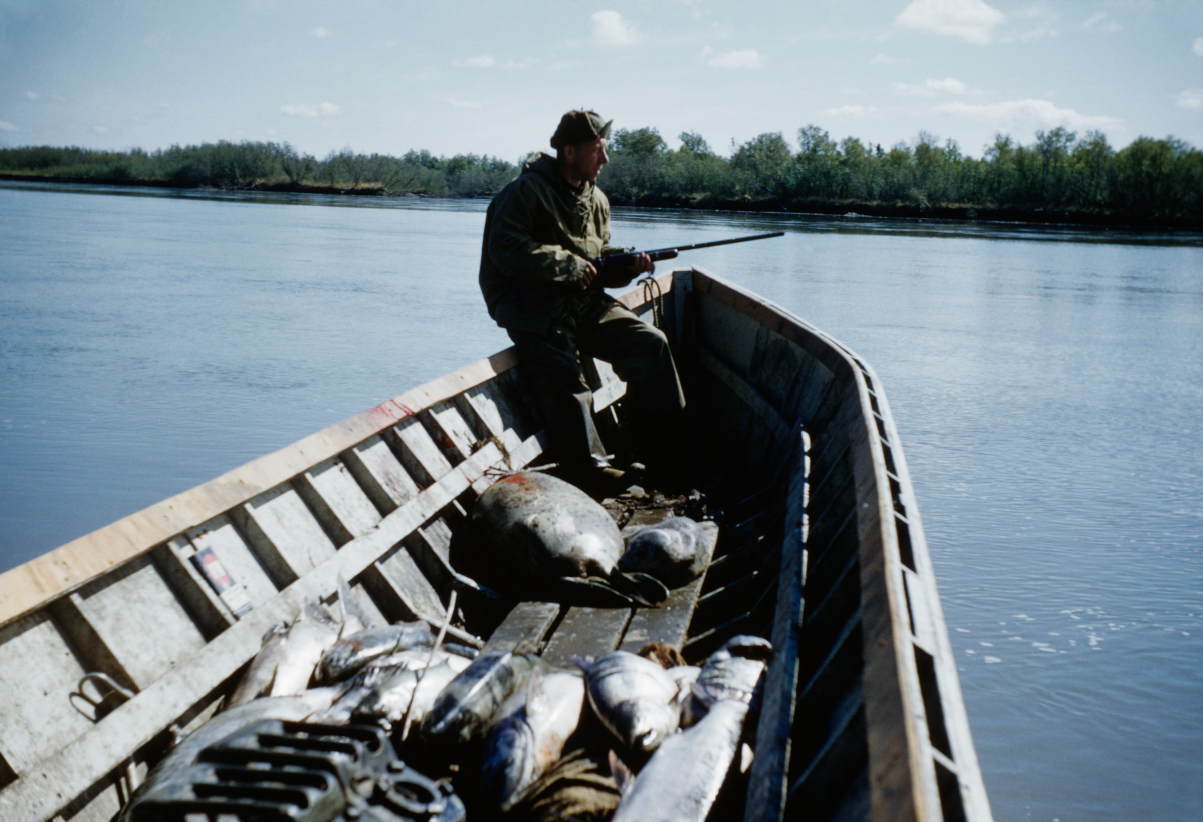 Alaska ’48 – Pilgrim River, Bob at Slate Creek mouth [man angling in river]