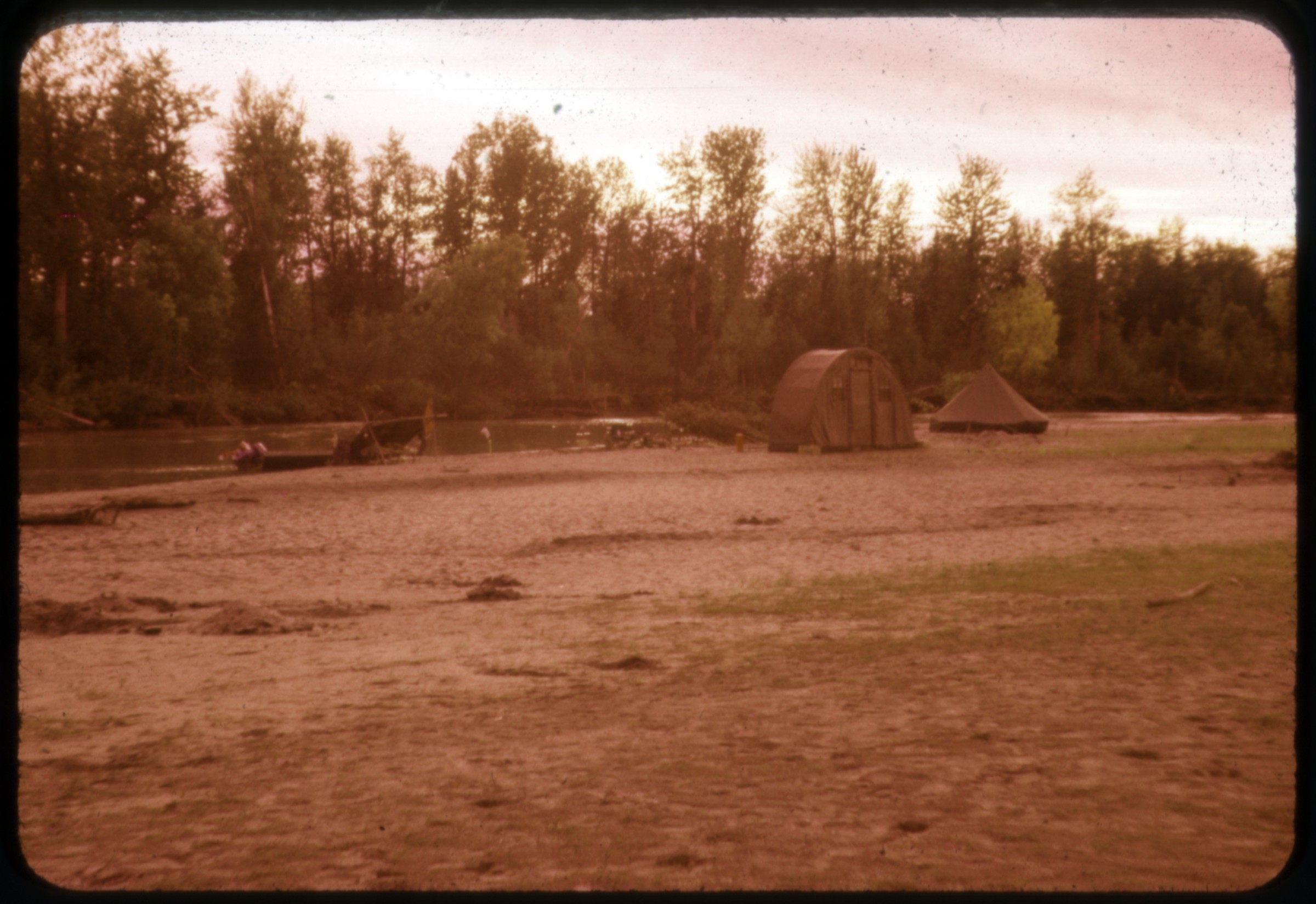 L25 Enroute to McKinley National Park "1946 postcard" [scenic view, lake or river, mountains, spurce, clouds, copy neg]