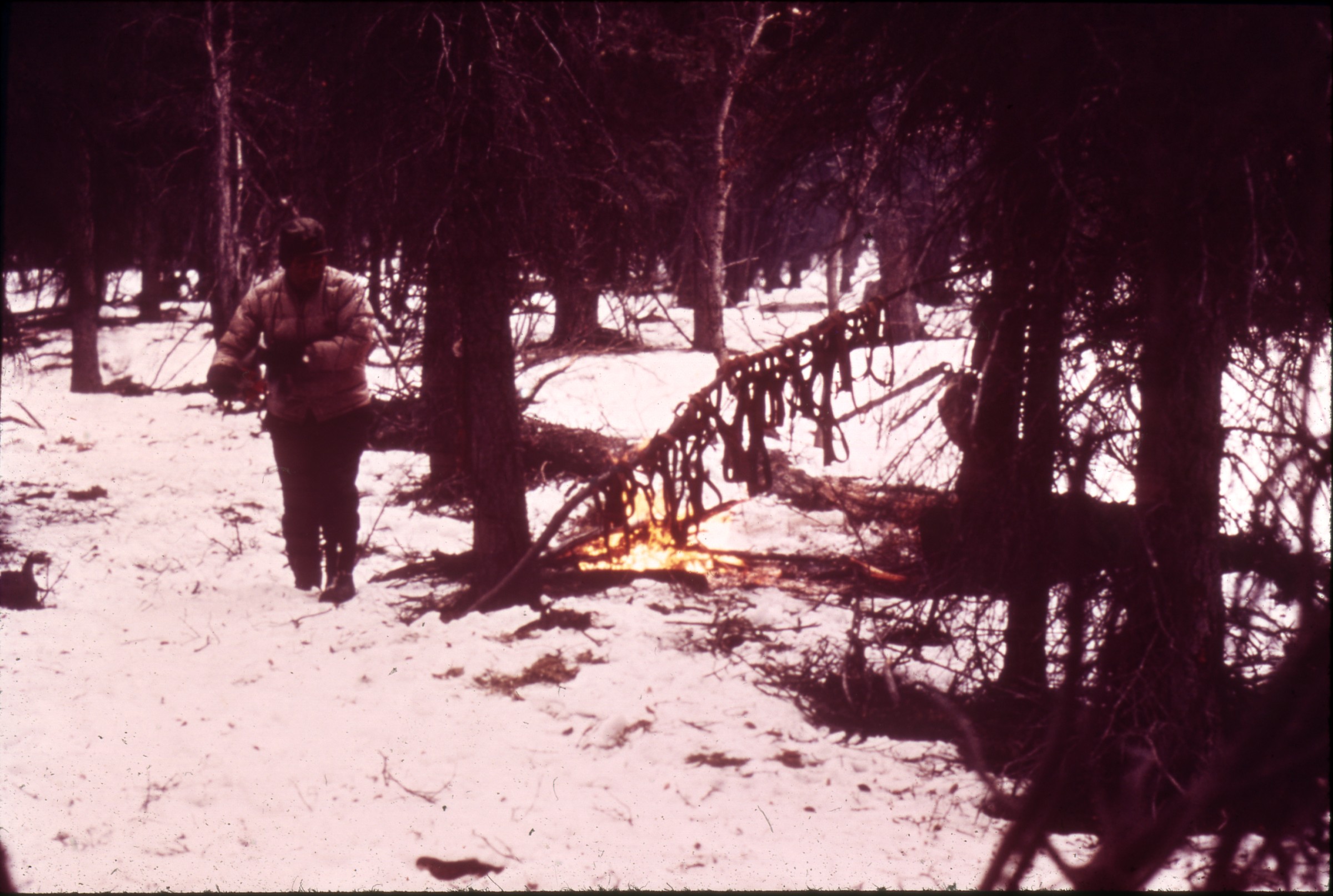 Animals: reindeer. Bringing up sled deer June 24, 1966. [people leading reindeer along path through snow, hills in background,]