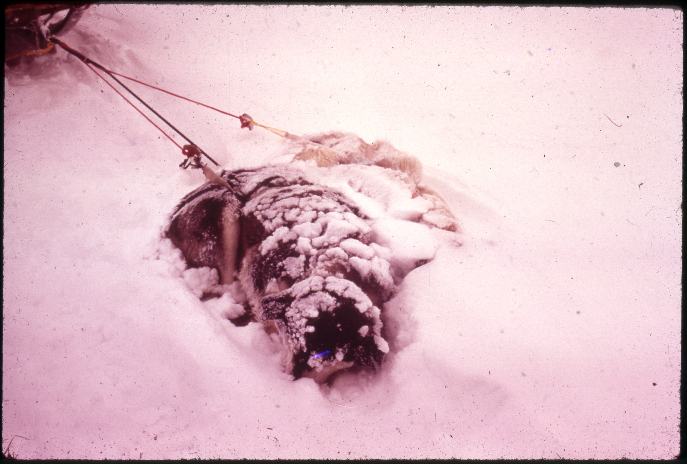 [dog harnessed to sled laying on winter trail, dog wearing booties]