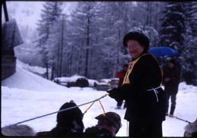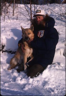 Sara Walch, 1995, [young woman posing, smiling and kneeling with two dogs, Huskies]