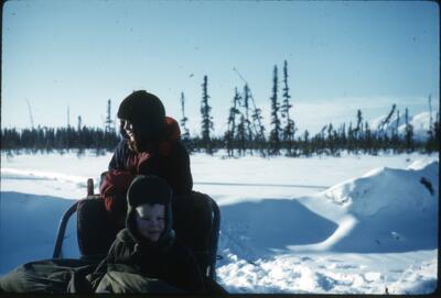 Alaska - Eskimo kids play in Barrow street in summer, 1986 [1961?; two Inupiat boys pose for camera; tracked vehicle in background]