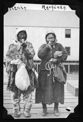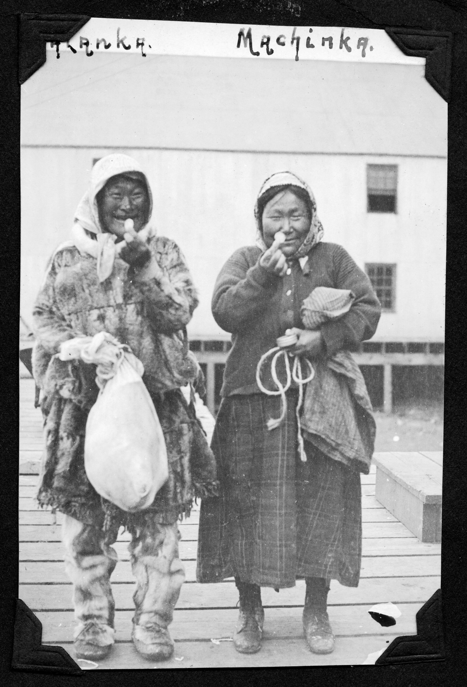 Keywords: Indigenous, BIPOC, Alaska, Alaskan, Girls, Young woman, Child, Children, Parka, Fur, Reindeer, Clothing, Outerwear, Western clothing, Footwear, Athletic shoes, Shoes, Sneakers, Converse, Tin cup, Village, Buildings, Houses, Structures, Inupiaq, Inupiat, Territory