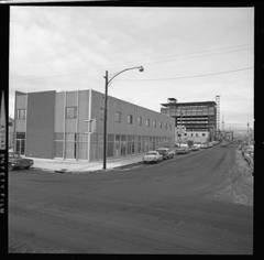 (Hewitt's Drugstore, Oct 12, 1963)[Hewitt's Drug Store as seen from 4th Avenue with light'>Anchorage All American City Banner hanging over the street]