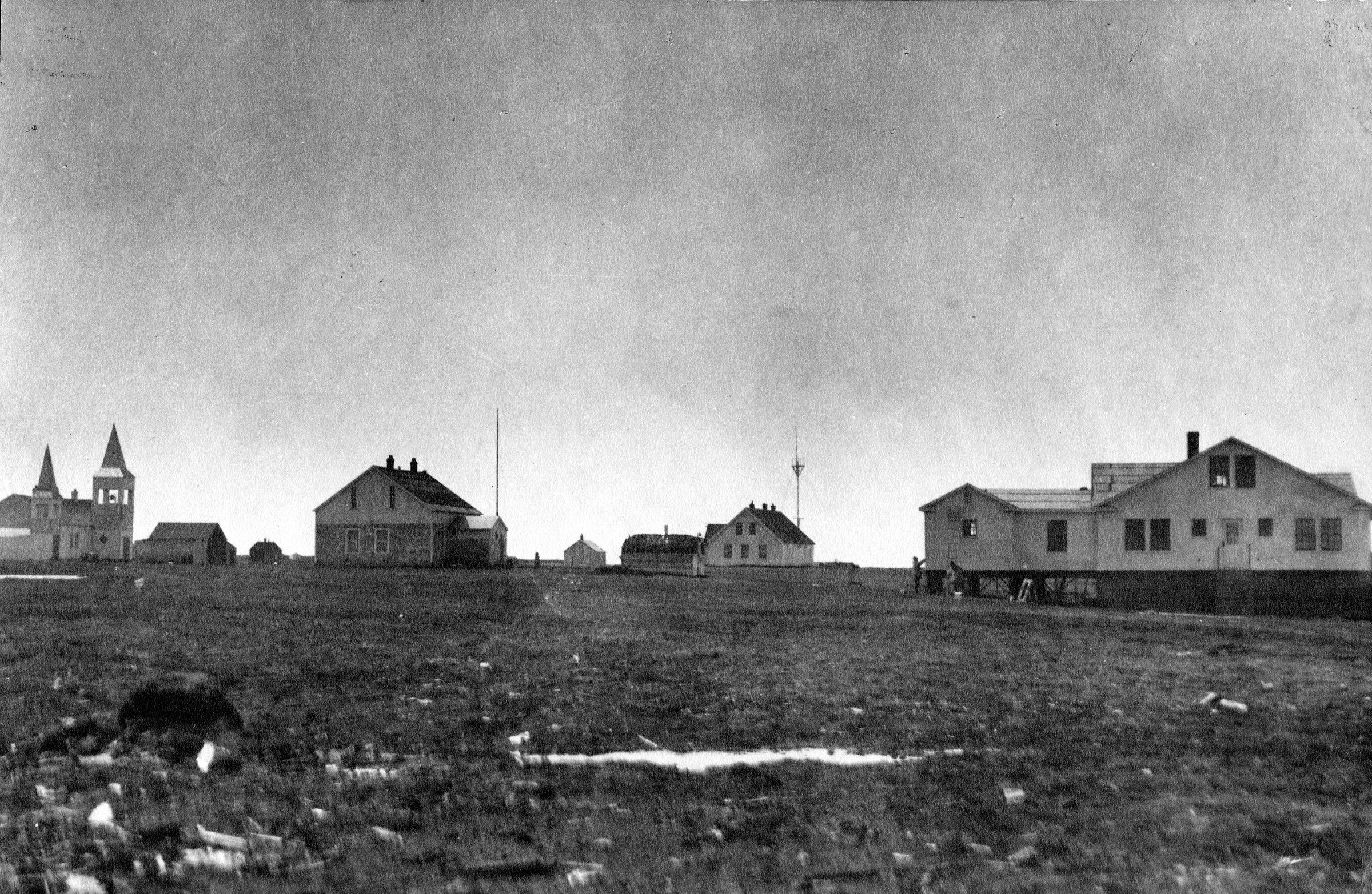 “Eklutna Industrial School, U.S. Government Department of the Interior, Bureau of Indian Affairs” Sassa Modook [young girl sitting on boardwalk in front of building] [Dena'ina Elnena, Idlughet]