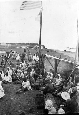 P-545. Palmer Day Dance, Palmer, Alaska, 5/15/37. Hewitt's Photo Shop, Anchorage [children dancing in yard, buildings and water tower in distance]