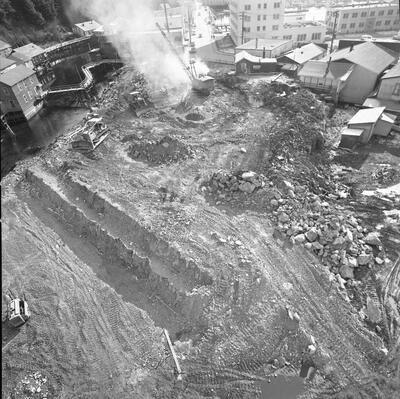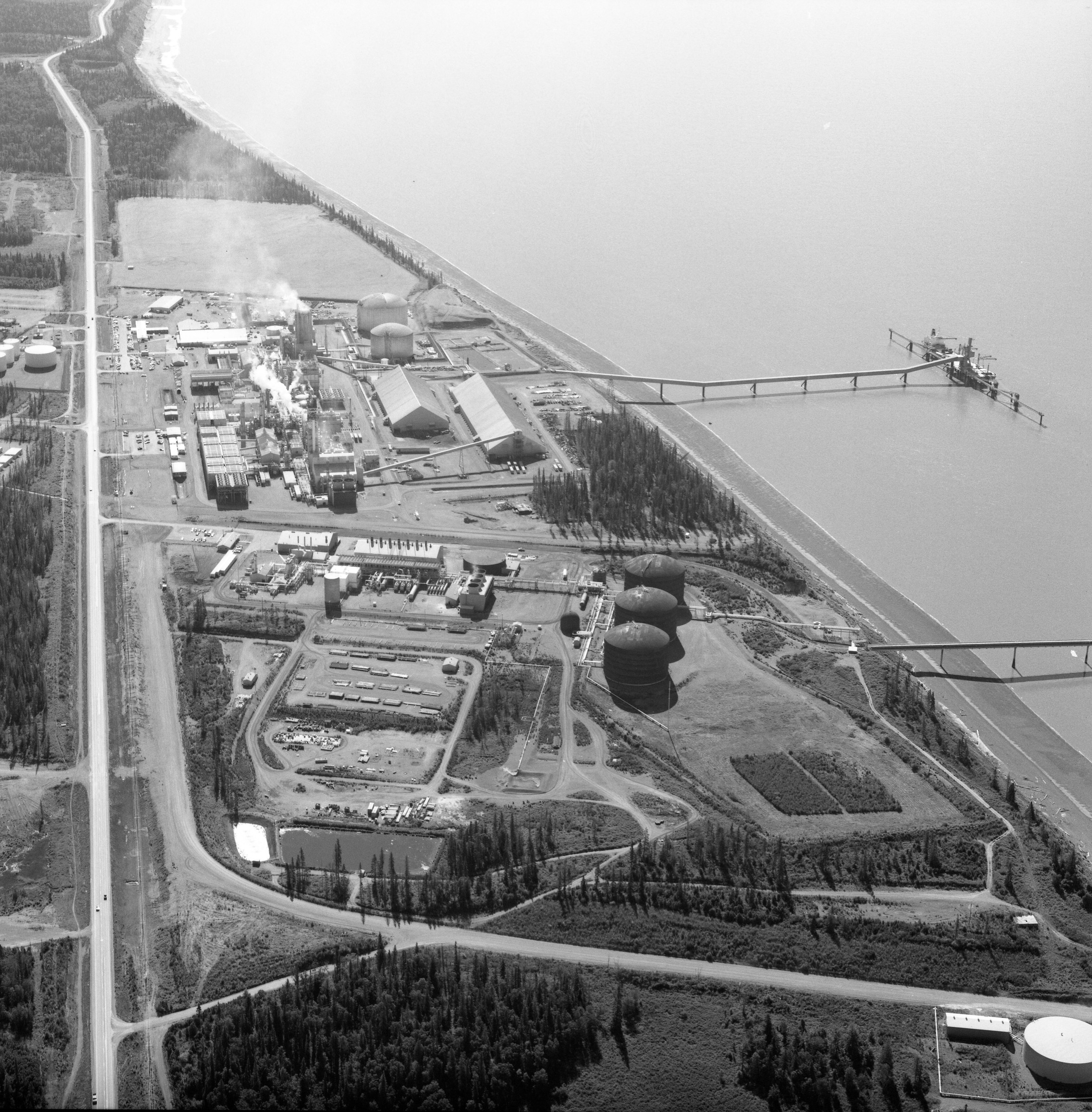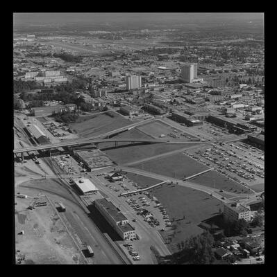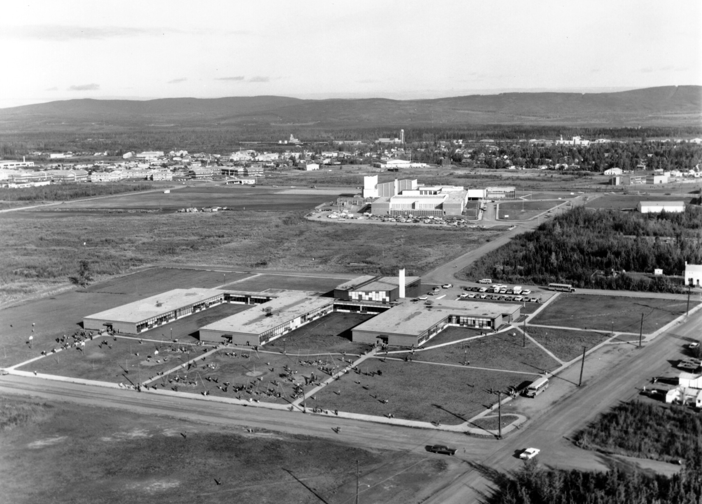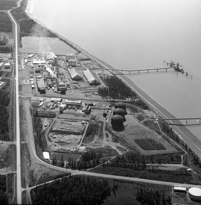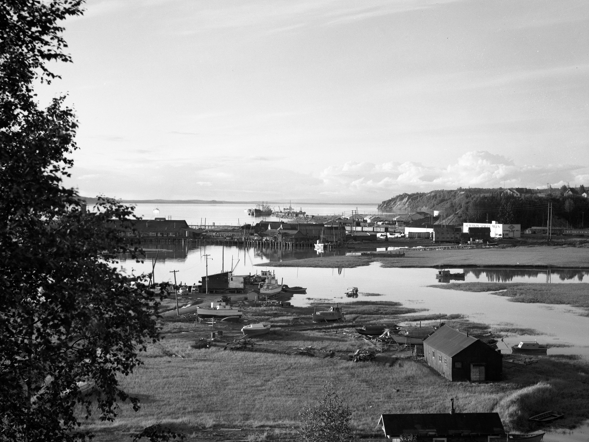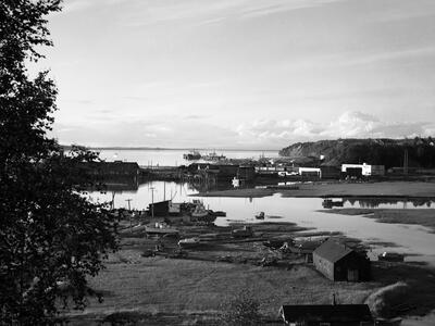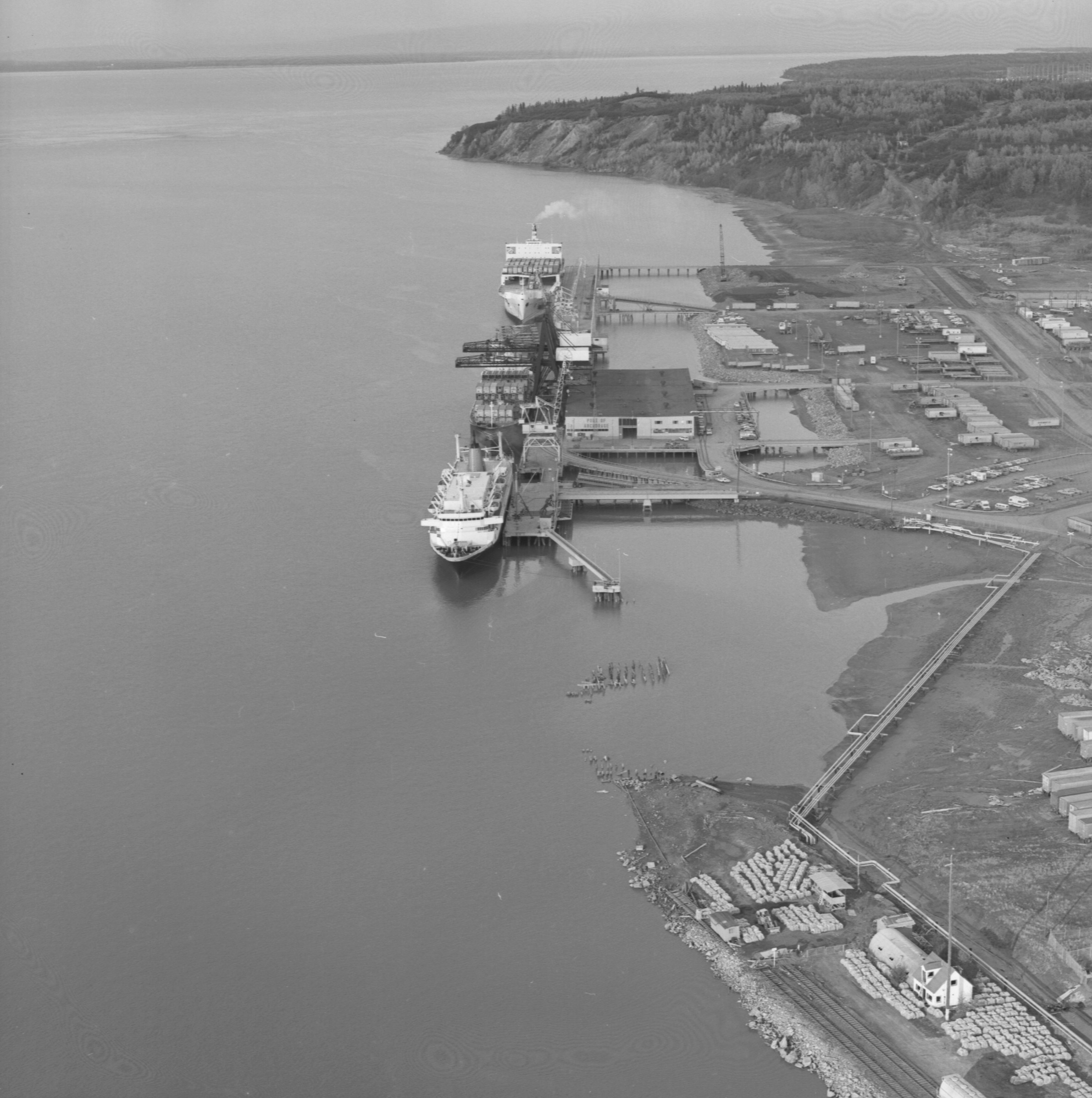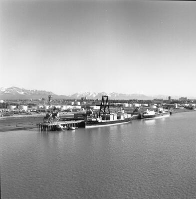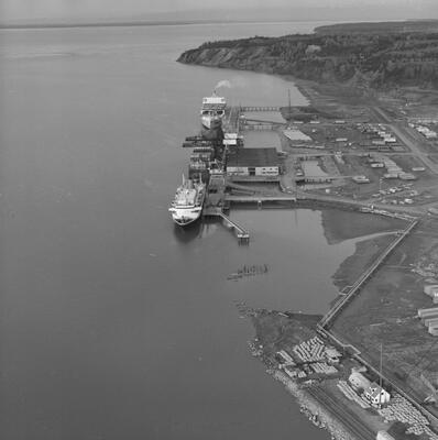 [bird's eye view of residential area in northwest Anchorage with Ship Creek, Anchorage docks, ship in Cook Inlet in distance; Sackett's Harbor at dock?]