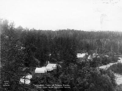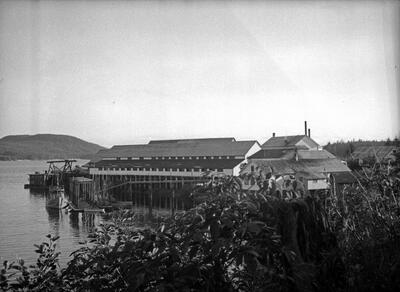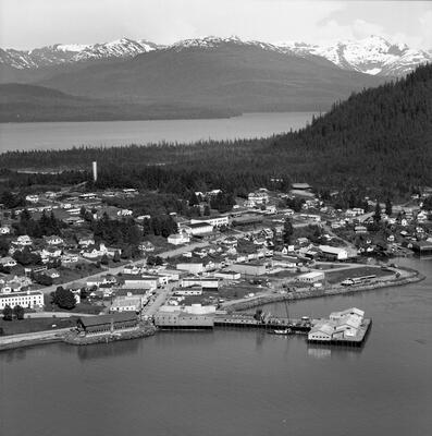 "Sticking shutter shots; Ellis Air Lines" [aerial view of coastal town, possibly Ocean Falls, BC (?); airplane float in left foreground; mountains]