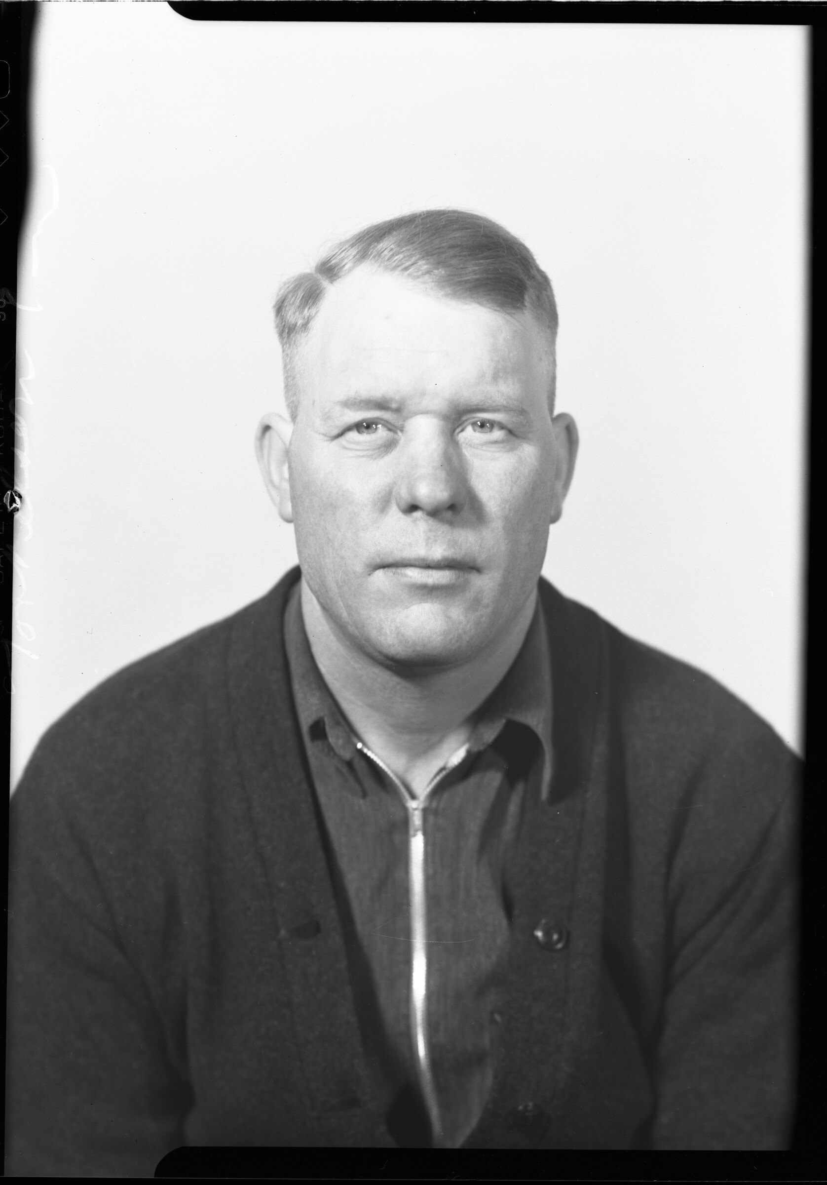 [Alaska Native man wearing Western style clothing and driving cap posed outdoors next to building. Original image cropped]