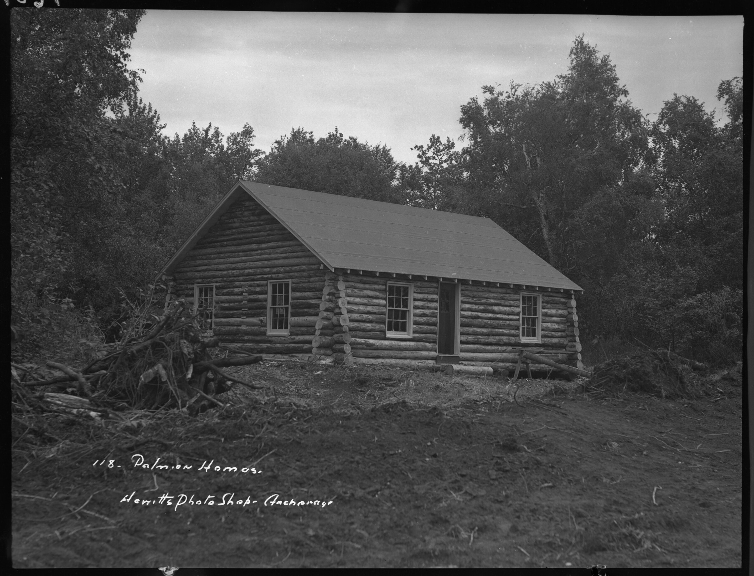 118. Palmer Homes. Hewitt's Photo Shop, Anchorage [log cabin in trees, Matanuska Colony]