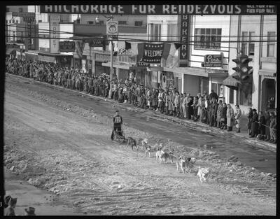 (Dog races, Fur Rondy 1952) [musher with bib #12 leading nine-dog team down Fourth Avenue past spectators, Fur Rendezvous banners and businesses including Anchorage Jewelers, The Gitchell, Lee's Menswear, Ship Creek Market, Dr. Hines Optometrist, J. Vic Brown & Son, Reed's, 515 Club, Lois Beauty Salon]